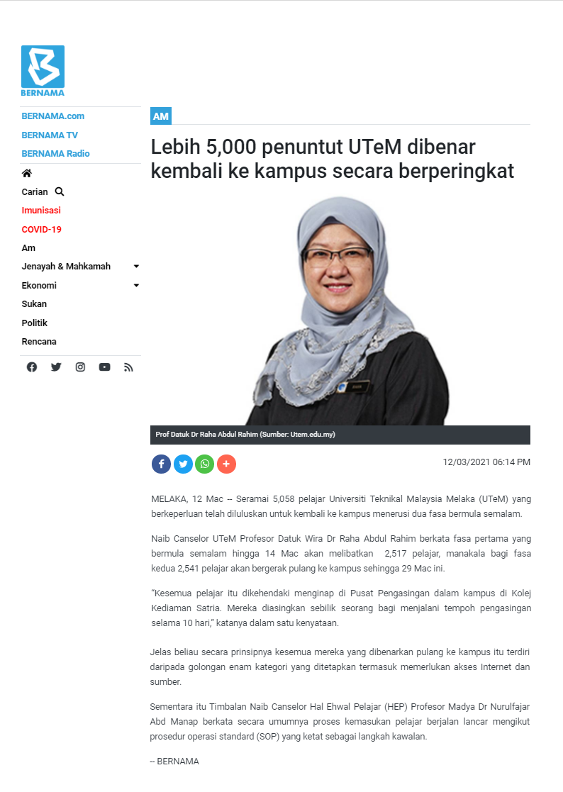 Lebih 5,000 penuntut UTeM dibenar kembali ke kampus secara berperingkat