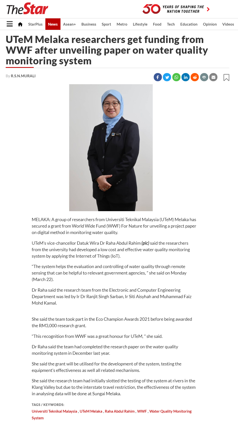 UTeM Melaka researchers get funding from WWF after unveiling paper on water quality monitoring system