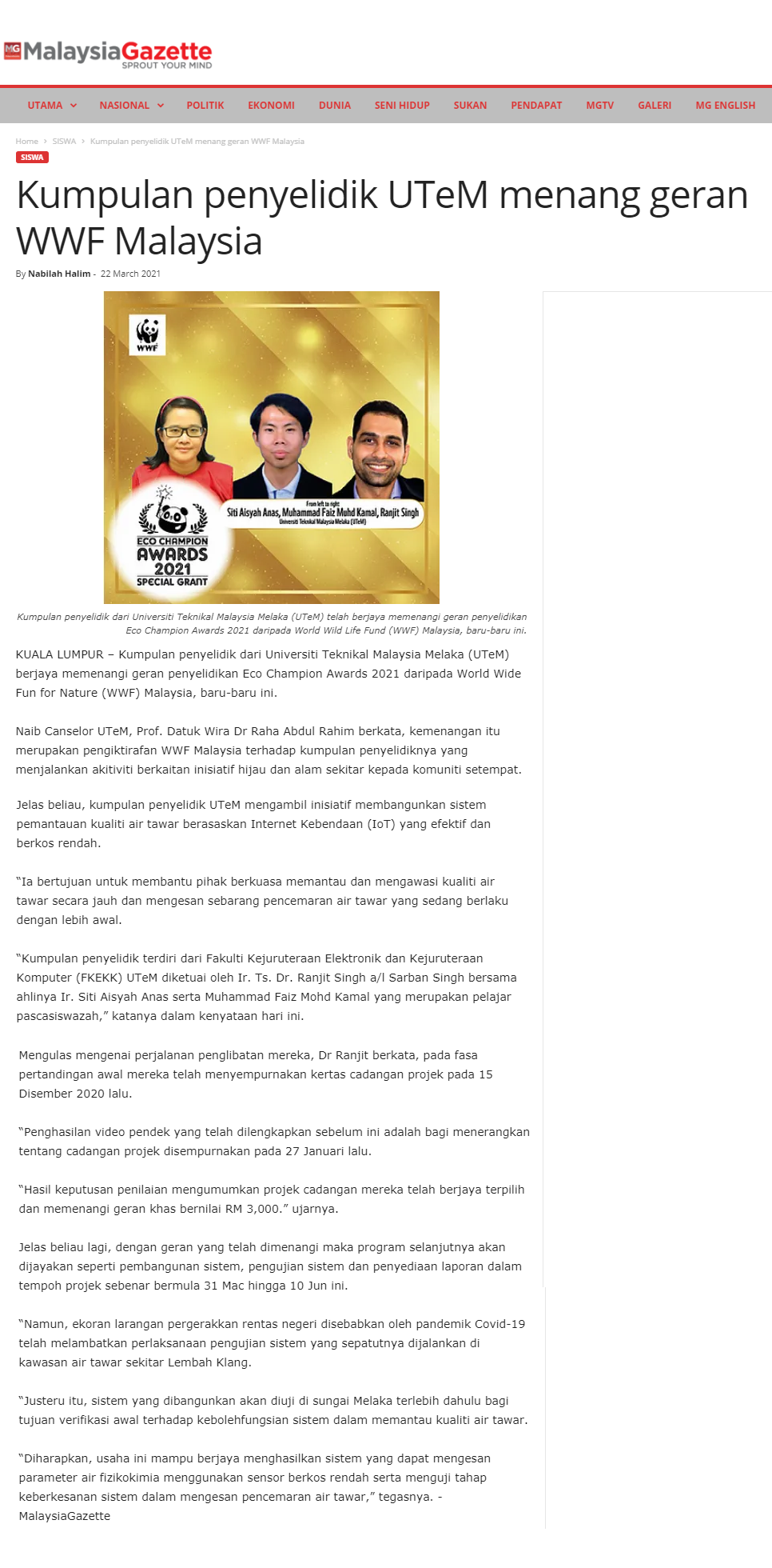 Kumpulan penyelidik UTeM menang geran WWF Malaysia