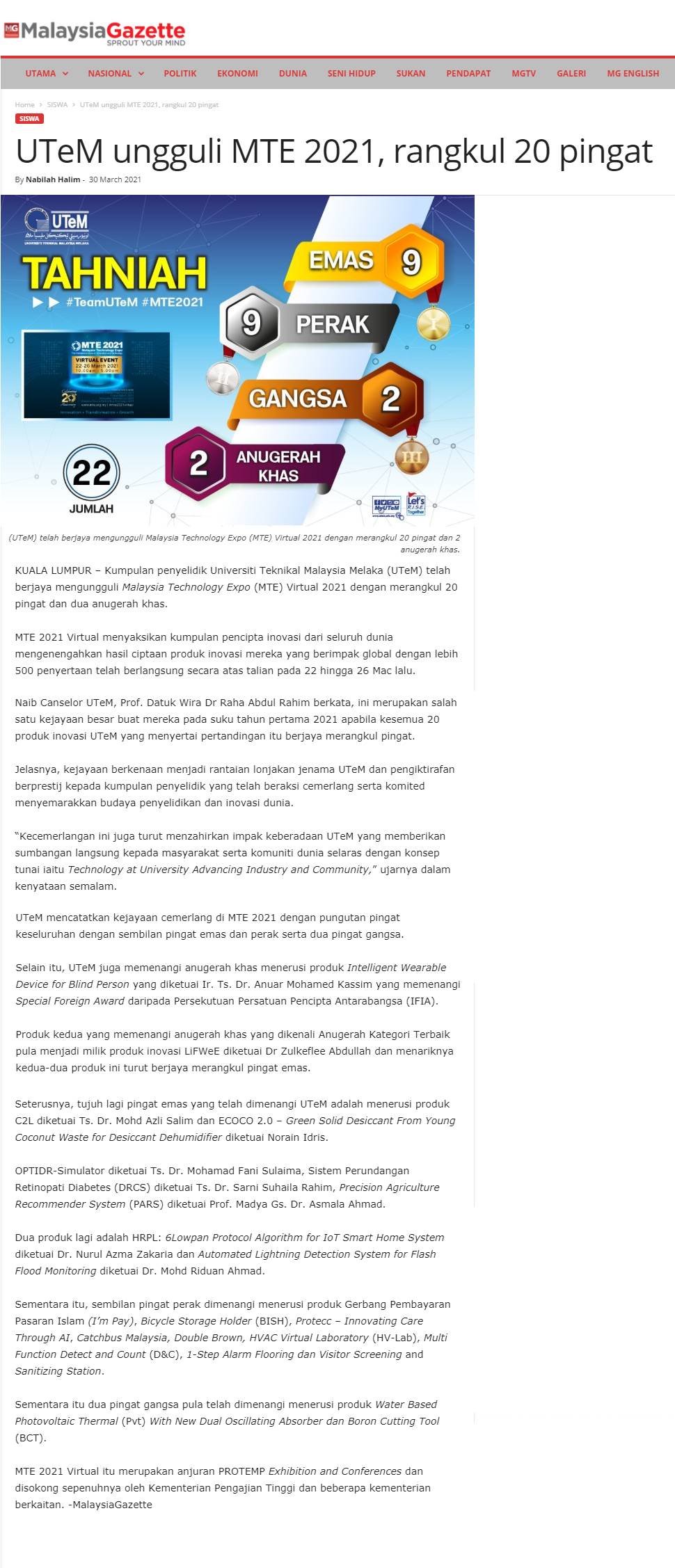UTeM ungguli MTE 2021, rangkul 20 pingat