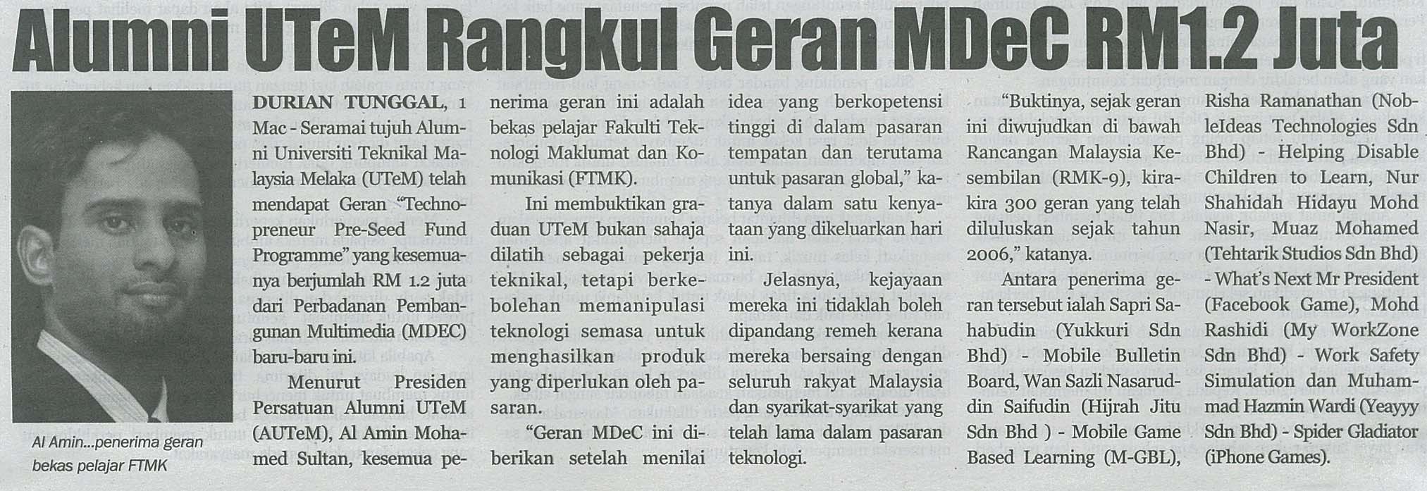 Alumni UTeM rangkul geran MDeC RM 1.2 juta