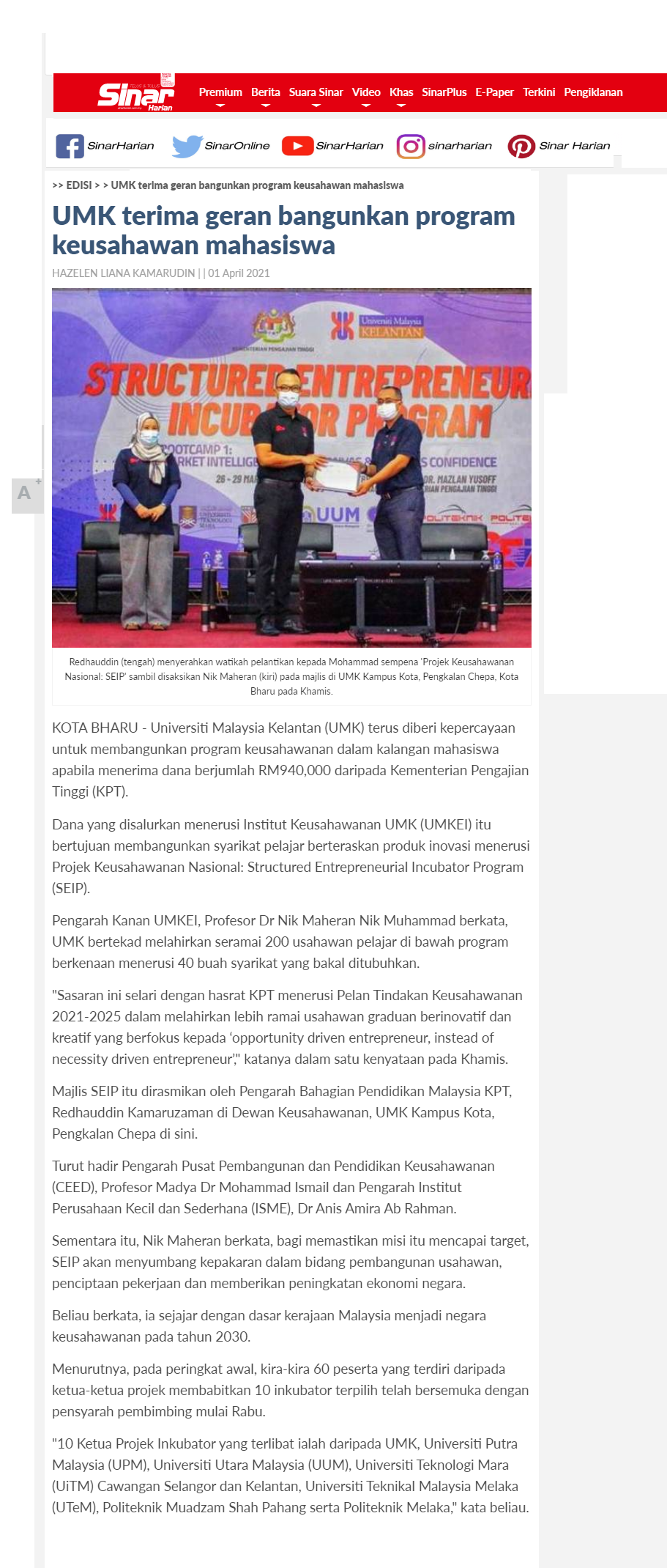 UMK terima geran bangunkan program keusahawan mahasiswa
