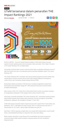 UTeM tersenarai dalam penarafan THE Impact Rankings 2021