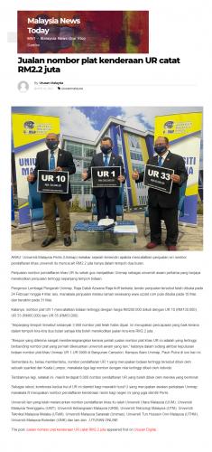 Jualan nombor plat kenderaan UR catat RM2.2 juta