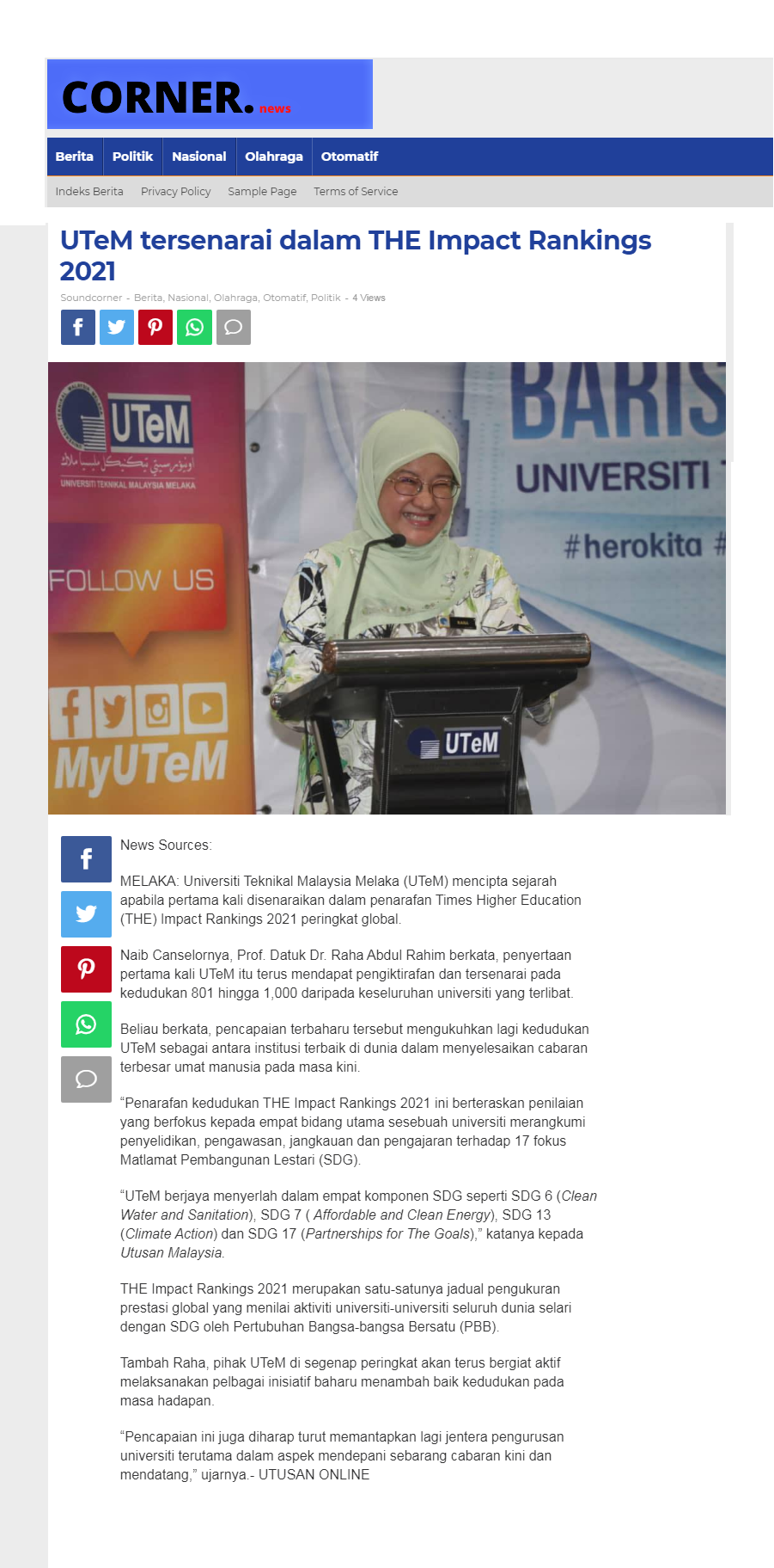 UTeM tersenarai dalam THE Impact Rankings 2021