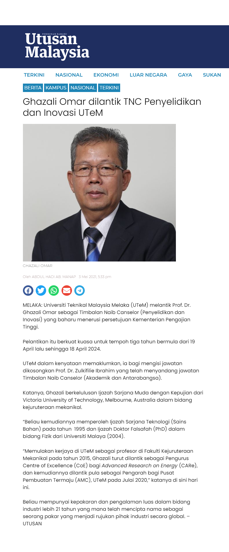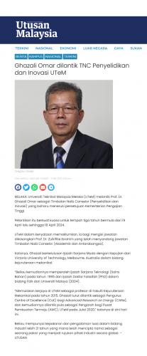 Ghazali Omar dilantik TNC Penyelidikan dan Inovasi UTeM