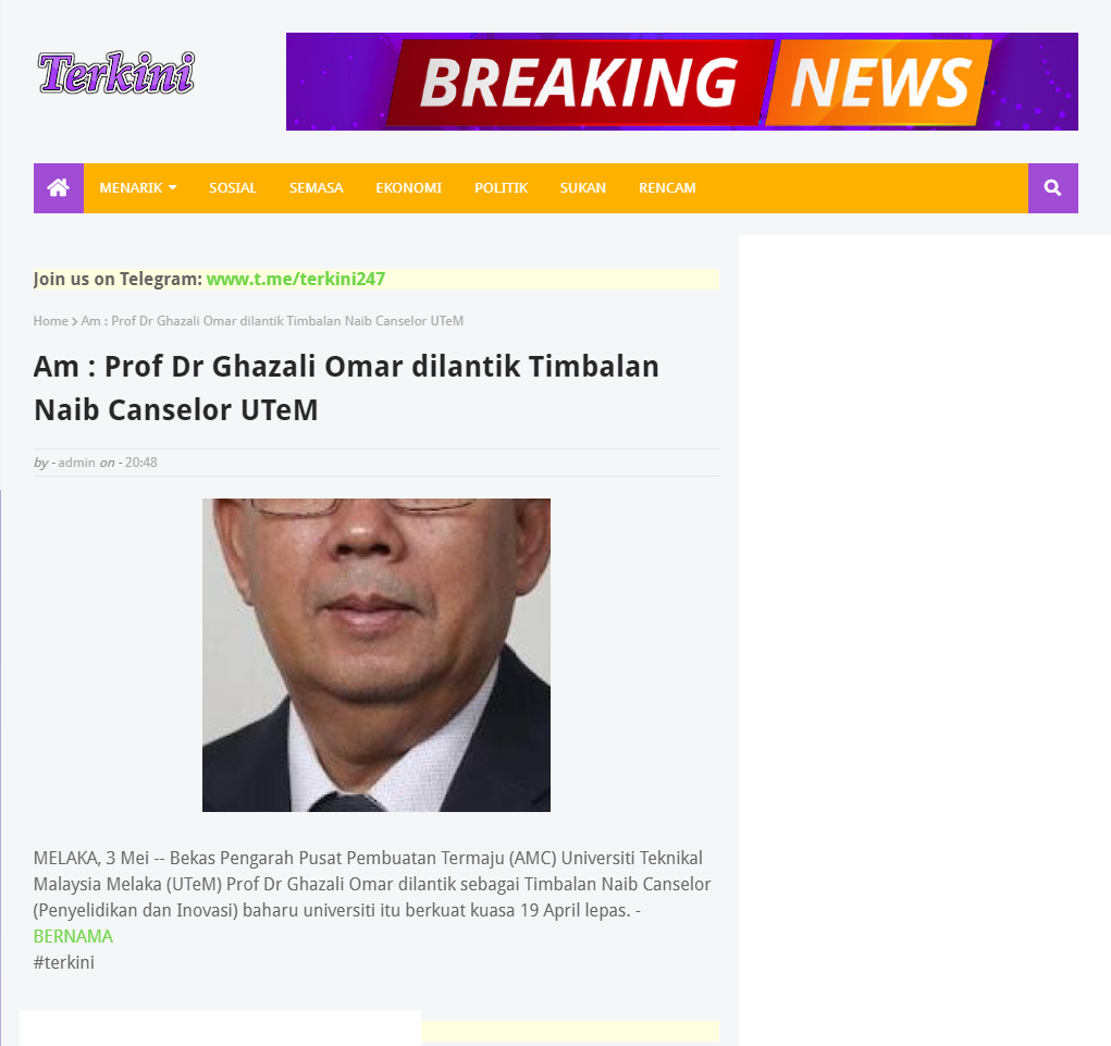 Am : Prof Dr Ghazali Omar dilantik Timbalan Naib Canselor UTeM