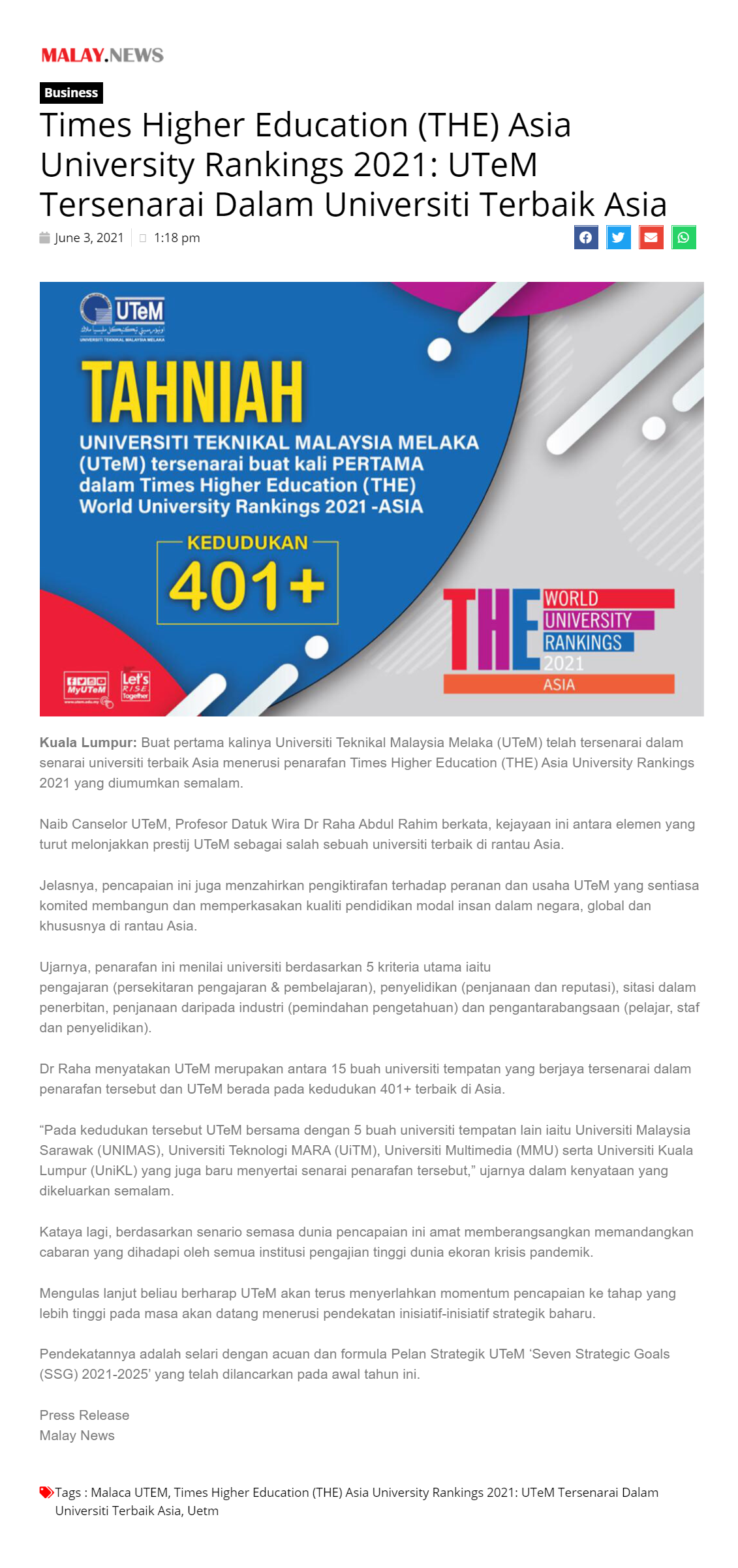 Times Higher Education (THE) Asia University Rankings 2021: UTeM Tersenarai Dalam Universiti Terbaik Asia