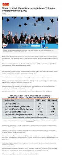 15 universiti di Malaysia tersenarai dalam THE Asia University Ranking 2021