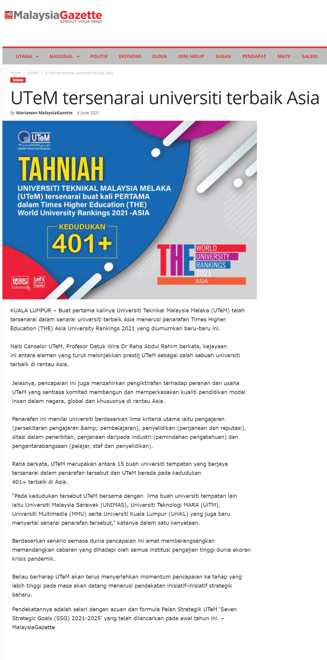 UTeM tersenarai universiti terbaik Asia