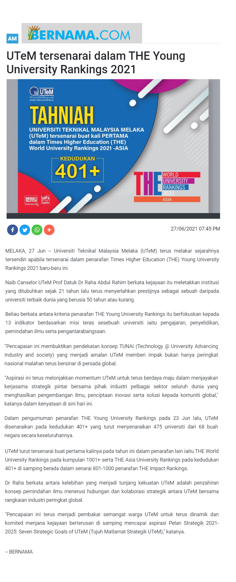 UTeM tersenarai dalam THE Young University Rankings 2021