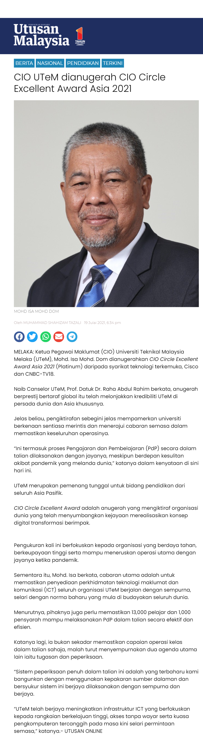 CIO UTeM dianugerah CIO Circle Excellent Award Asia 2021