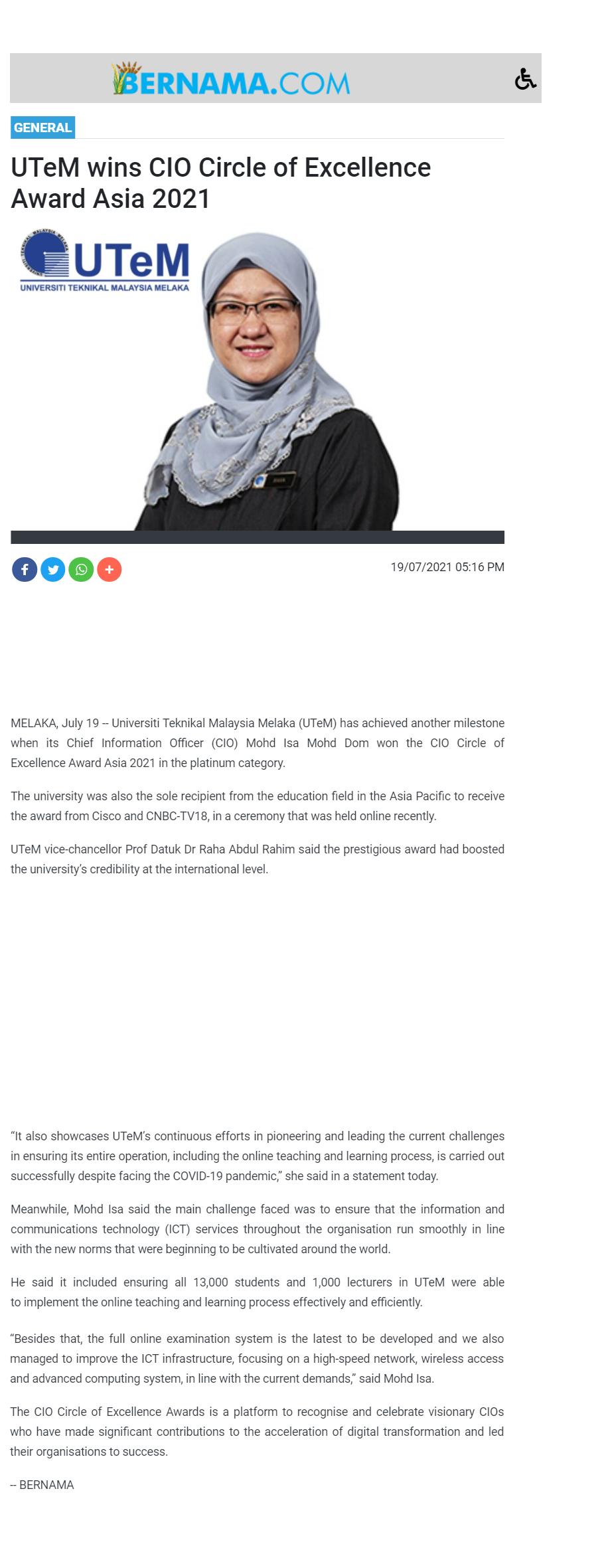 UTeM wins CIO Circle of Excellence Award Asia 2021