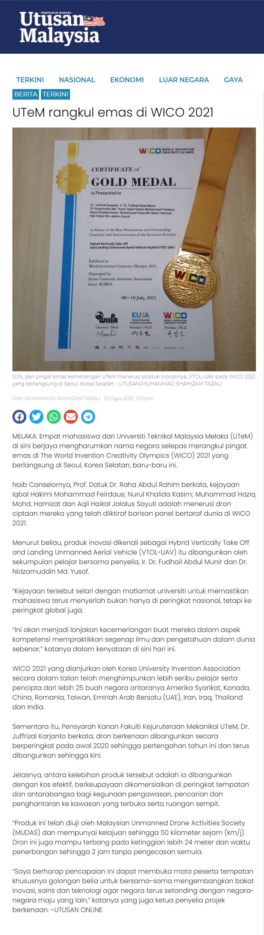 UTeM rangkul emas di WICO 2021