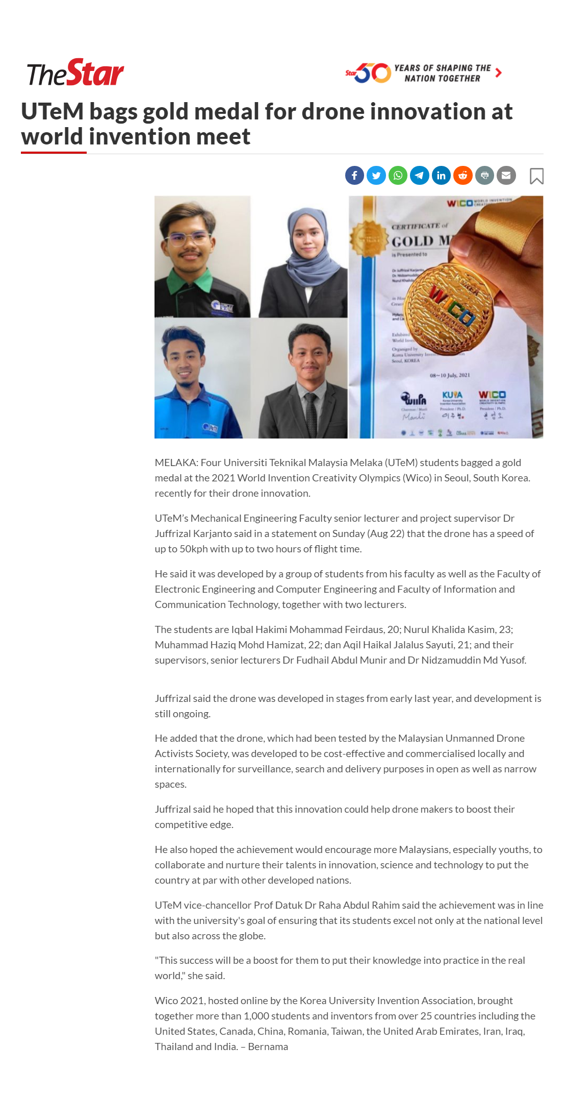UTeM bags gold medal for drone innovation at world invention meet