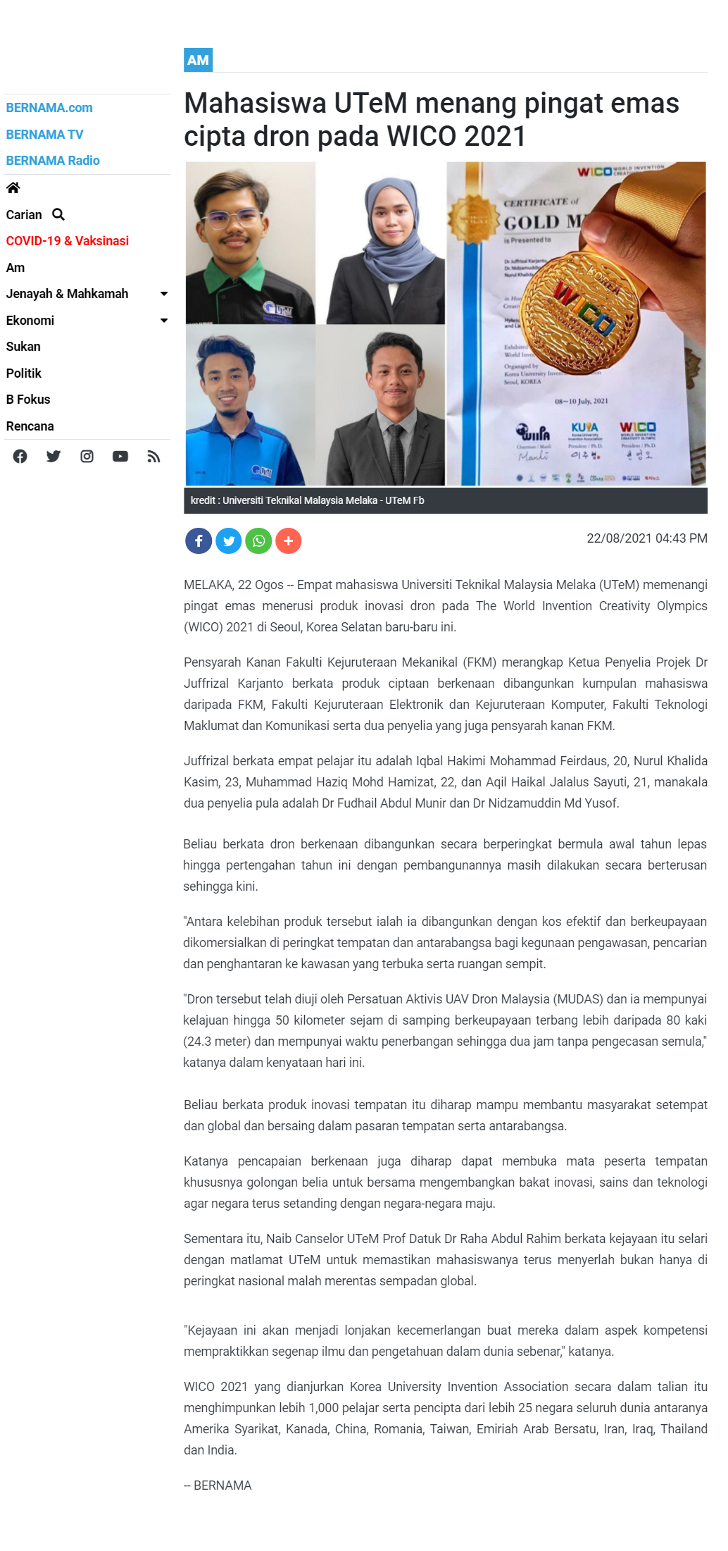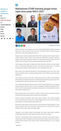 Mahasiswa UTeM memang pingat emas cipta drone pada WICO 2021