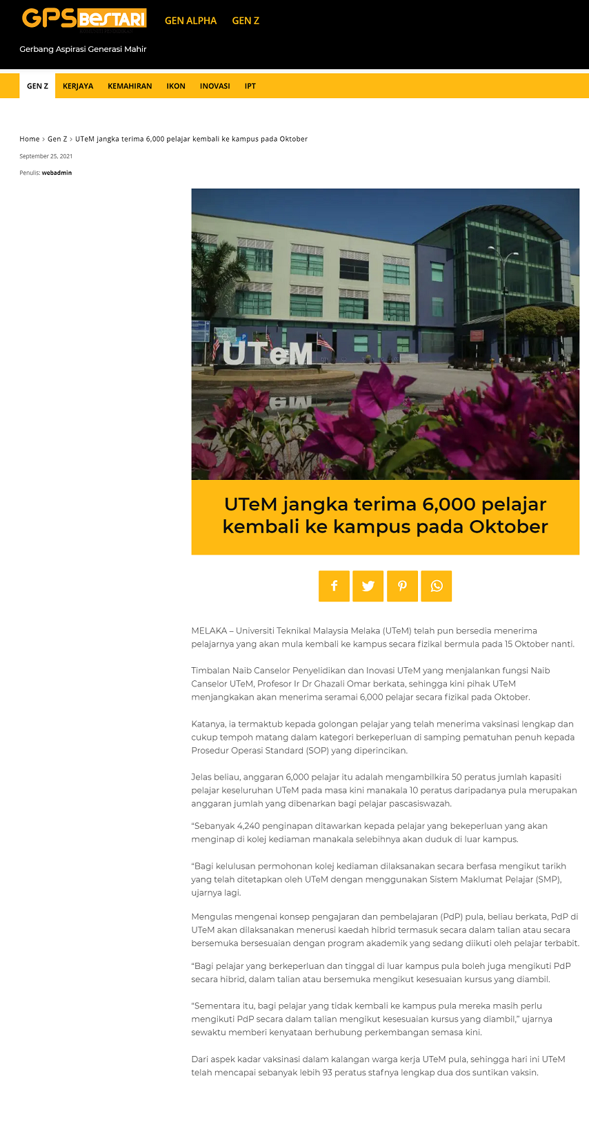 UTeM jangka terima 6,000 pelajar kembali ke kampus pada Oktober