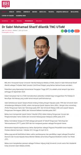 Dr Sabri Mohamad Sharif dilantik TNC UTeM