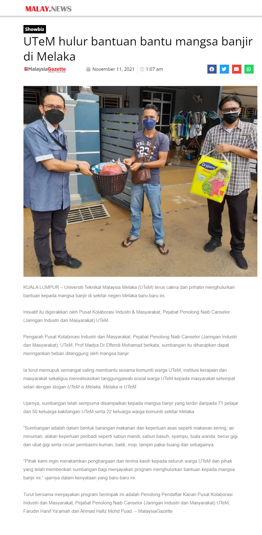 UTeM hulur bantuan bantu mangsa banjir di Melaka