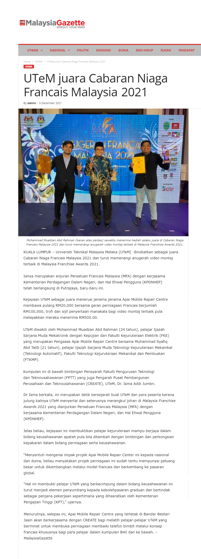 UTeM juara Cabaran Niaga Francais Malaysia 2021