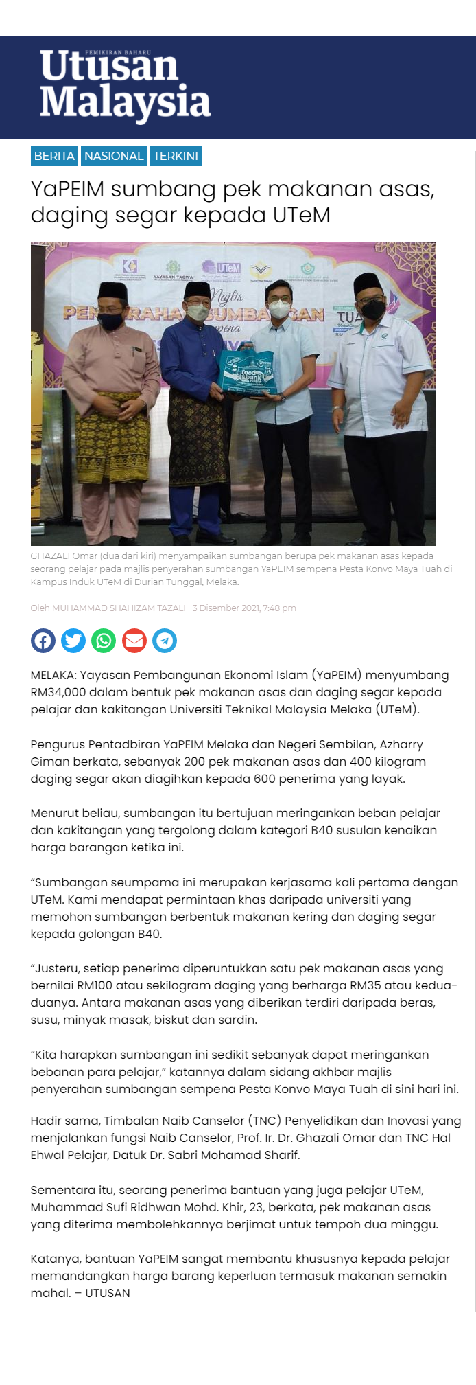 YaPEIM sumbang pek makanan asas, daging segar kepada UTeM
