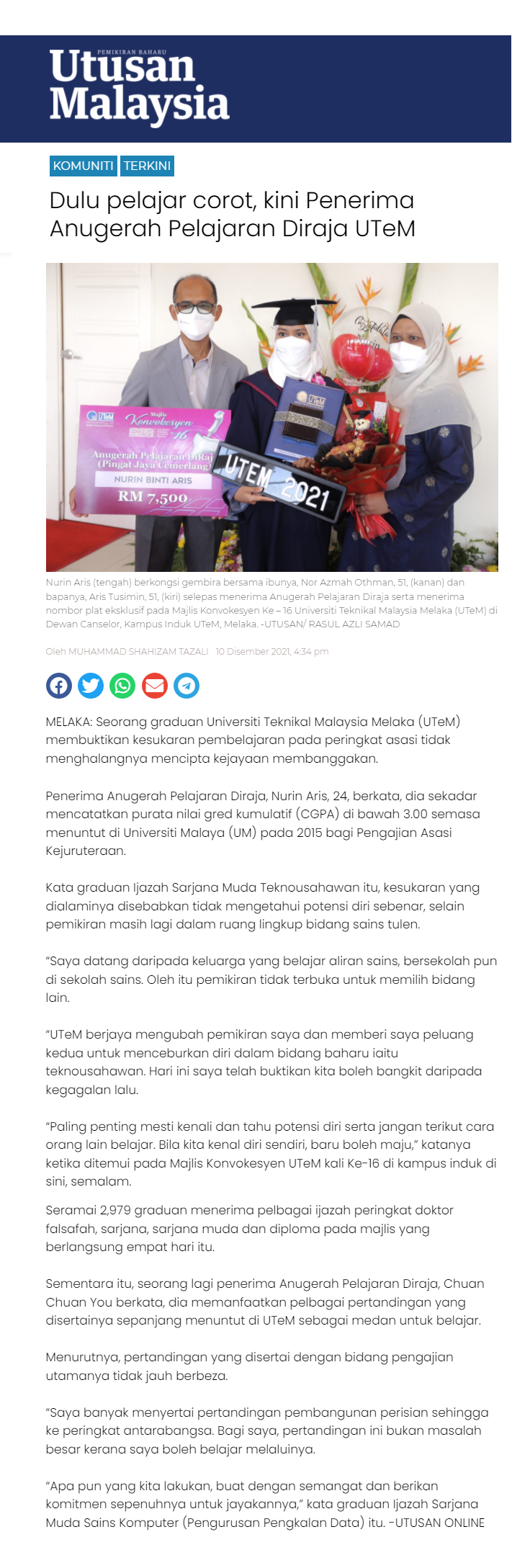 Dulu pelajar corot, kini Penerima Anugerah Pelajaran Diraja UTeM