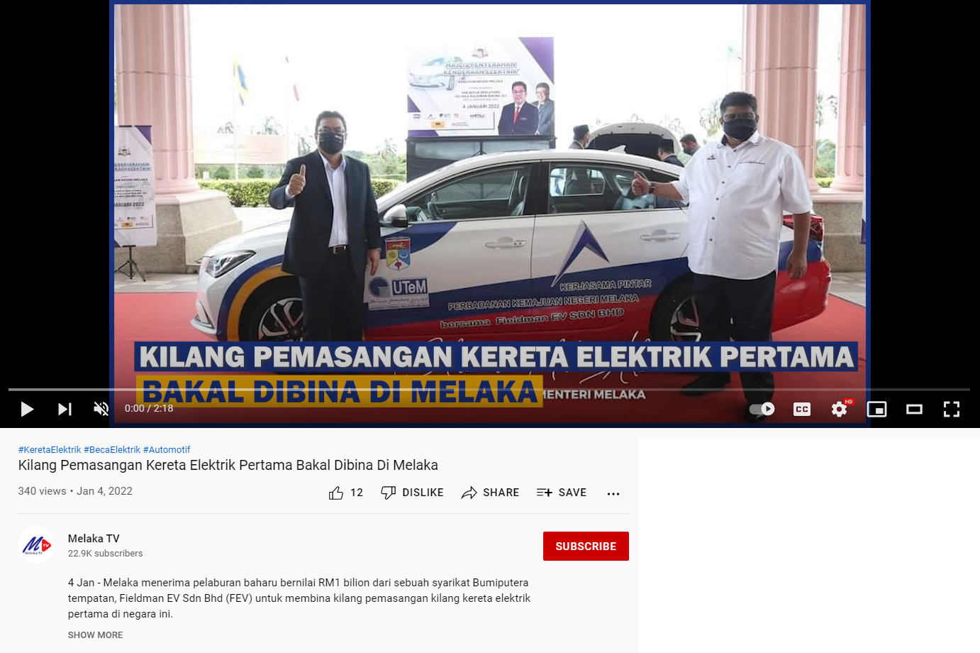 Kilang Pemasangan Kereta Elektrik Pertama Bakal Dibina Di Melaka