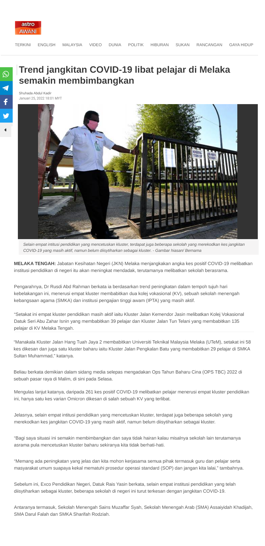 Trend jangkitan COVID-19 libat pelajar di Melaka semakin membimbangkan