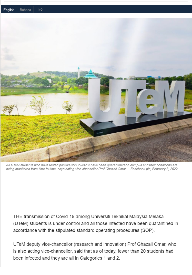 Covid-19 spread in UTeM under control, says don