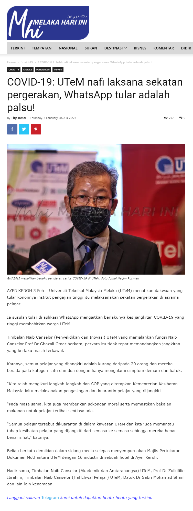 COVID-19: UTeM nafi laksana sekatan pergerakan, WhatsApp tular adalah palsu!