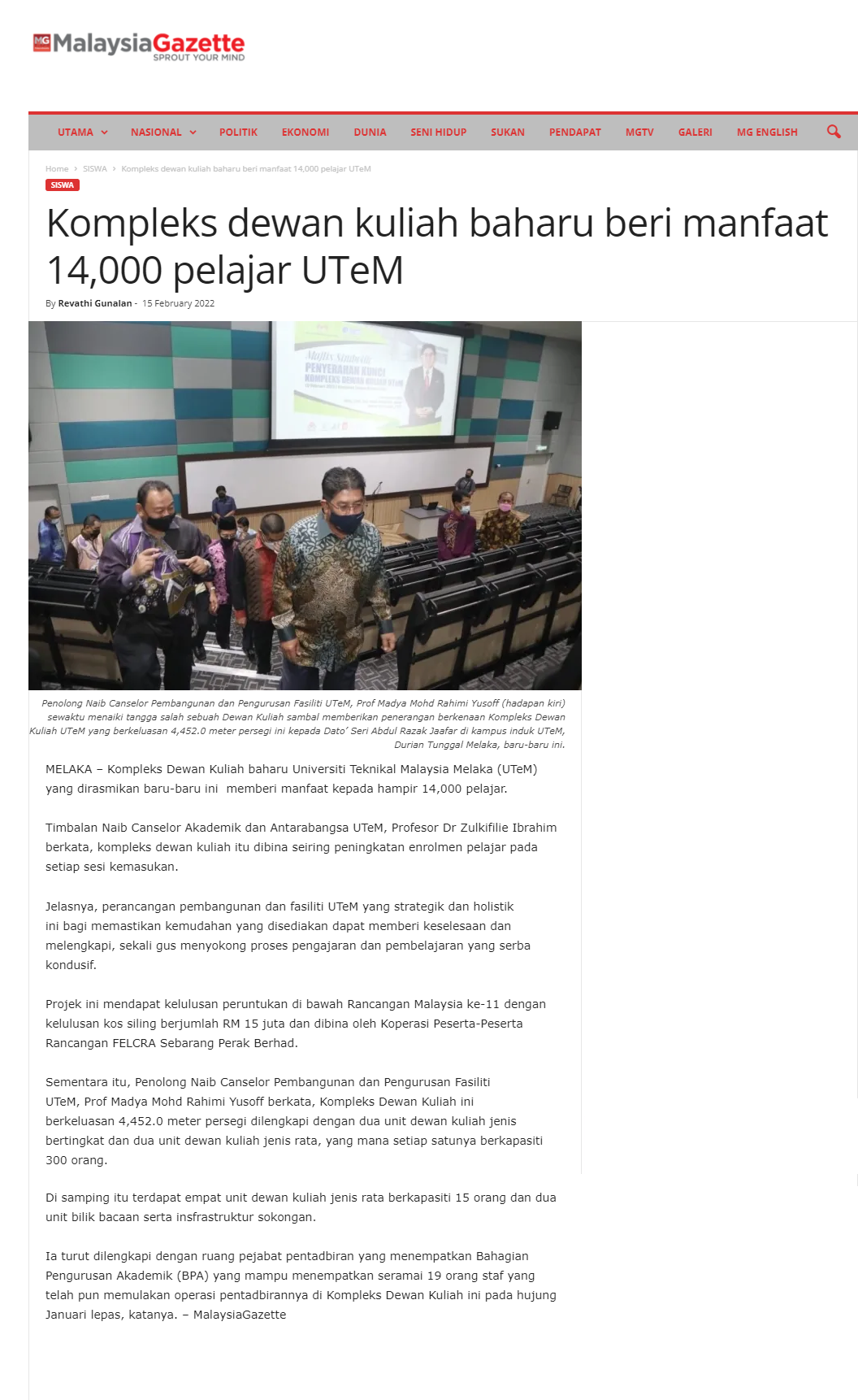 Kompleks dewan kuliah baharu beri manfaat 14,000 pelajar UTeM