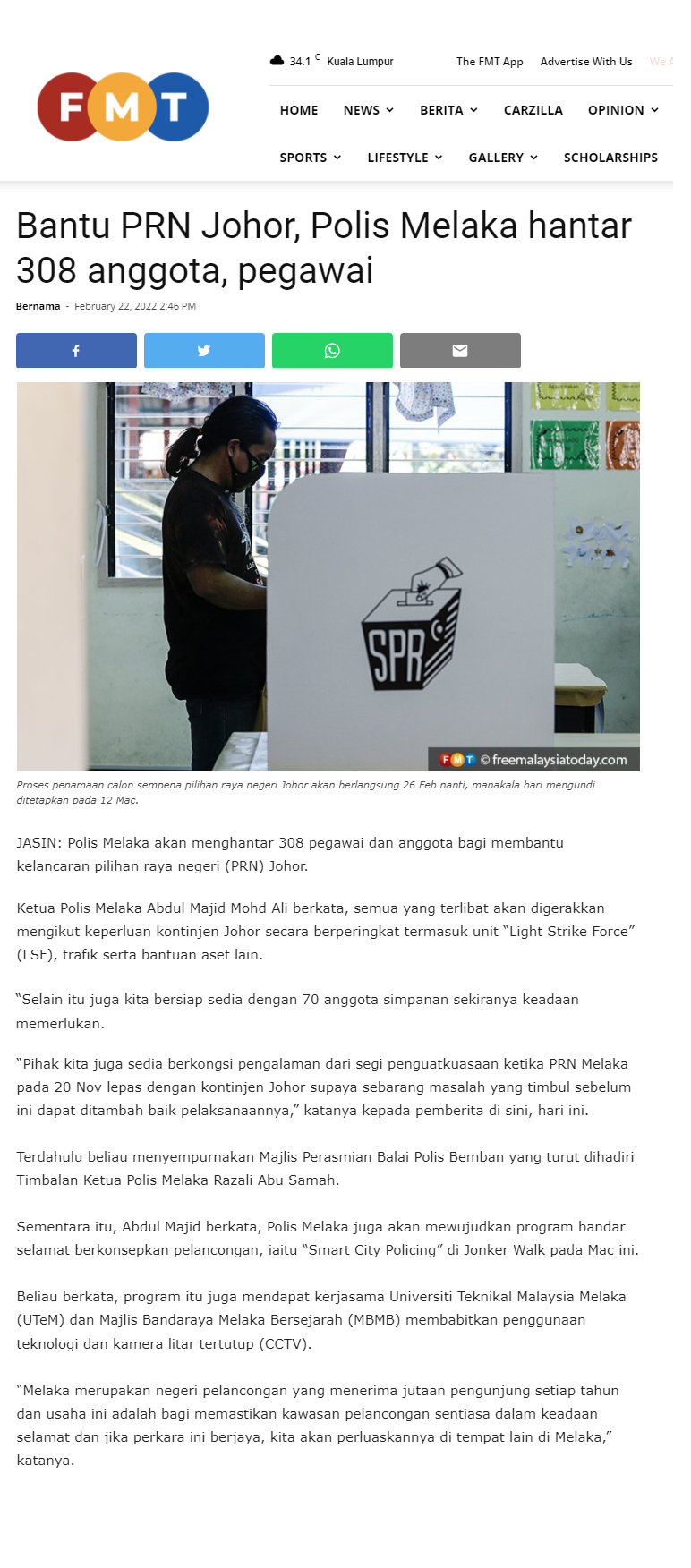 Bantu PRN Johor, Polis Melaka hantar 308 anggota, pegawai