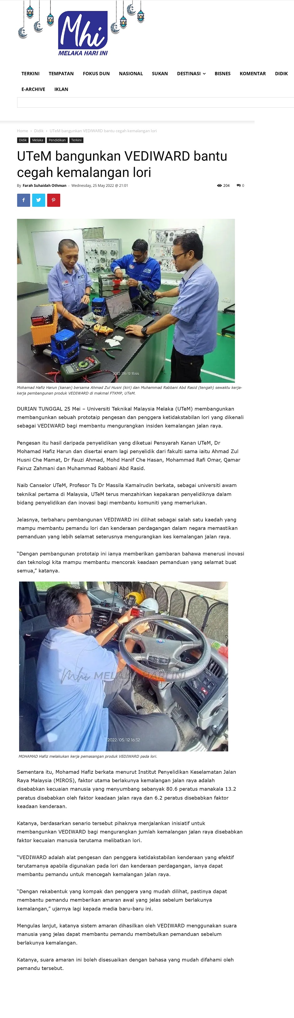 UTeM bangunkan VEDIWARD bantu cegah kemalangan lori
