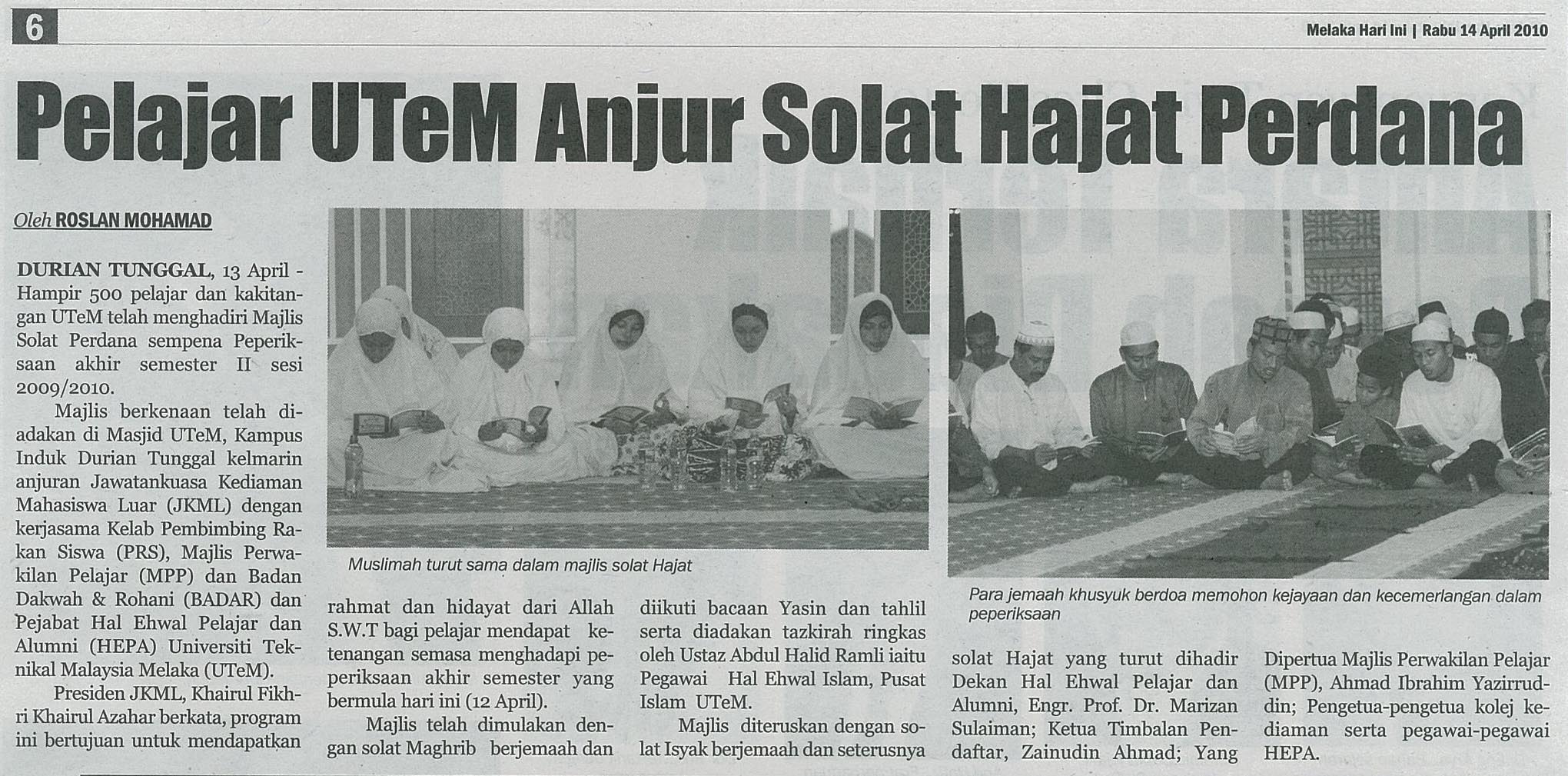Pelajar UTeM Anjur Solat Hajat Perdana