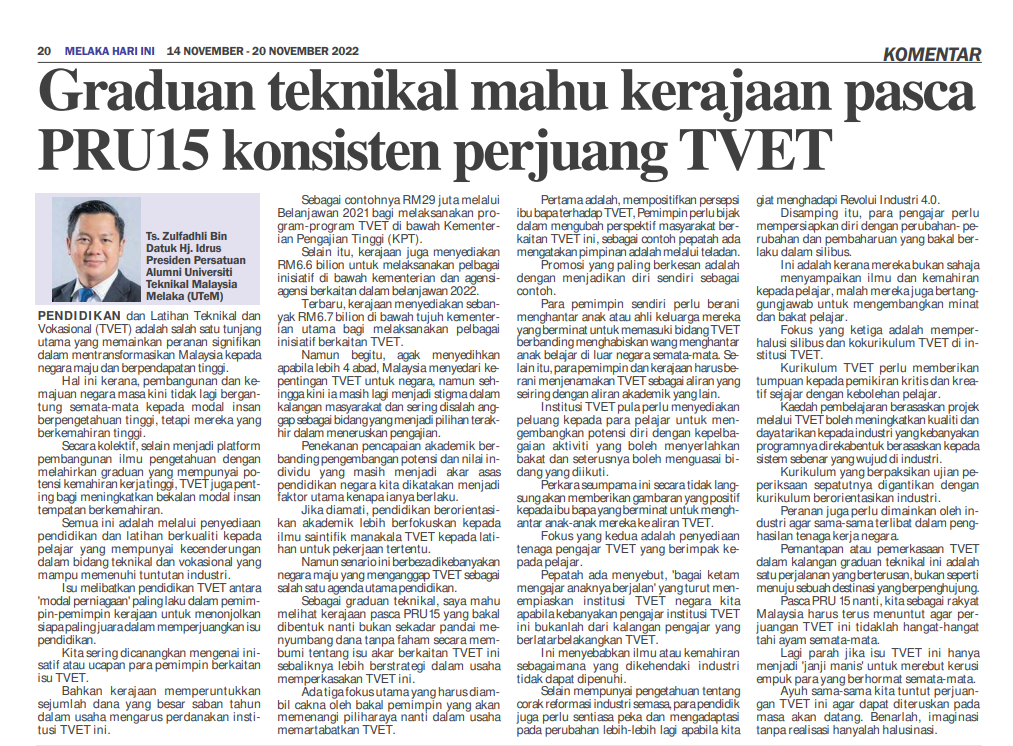 Graduan teknikal mahu kerajaan pasca PRU15 konsisten perjuang TVET
