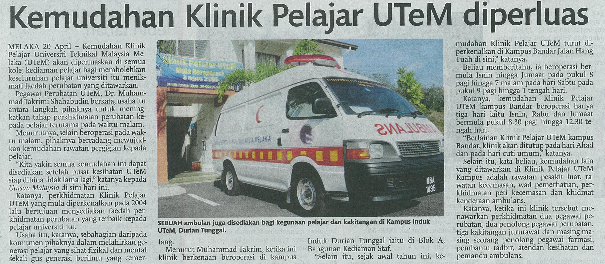 Kemudahan Klinik Pelajar UTeM diperluas